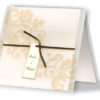 Eleganckie zaproszenie z najnowszej włoskiej kolekcji. Okładka w tonacji ecru z perłowymi gałązkami. Środek perłowy w kolorze ecru. Na środku wkładki umieszczone jest wytłoczone złote kółeczko, wewnątrz którego znajduje się perłowe serduszko. Wokół kółeczka znajdują się wycięcia, przez które przełożone są brzegi okładki.